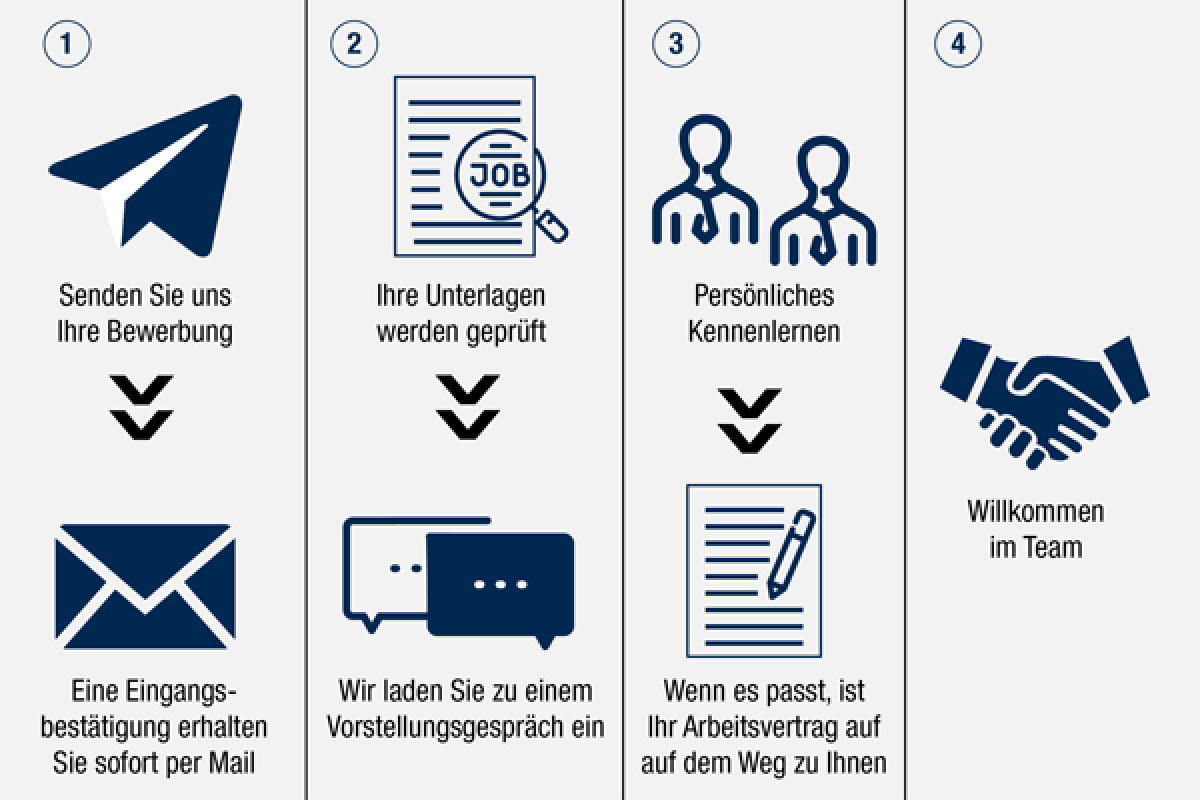 - Wenn Sie in die nähere Auswahl fallen, laden wir Sie zu einem persönlichen oder digitalen Vorstellungsgespräch ein.